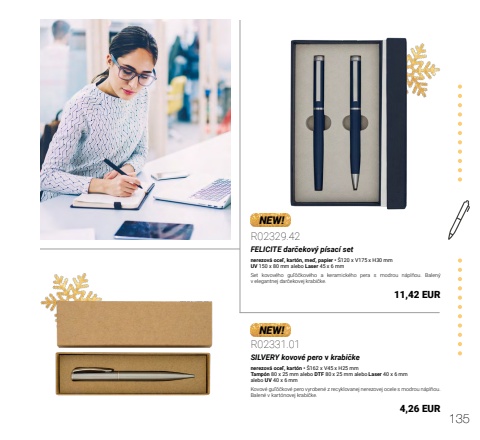 135R02329.42FELICITE dar%u010dekov%u00fd p%u00edsac%u00ed setnerezov%u00e1 oce%u013e, kart%u00f3n, me%u010f, papier %u2022 %u0160120 x V175 x H30 mmUV 150 x 80 mm alebo Laser 45 x 6 mmSet kovov%u00e9ho gu%u013e%u00f4%u010dkov%u00e9ho a keramick%u00e9ho pera s modrou n%u00e1pl%u0148ou. Balen%u00fd v elegantnej dar%u010dekovej krabi%u010dke.11,42 EURR02331.01SILVERY kovov%u00e9 pero v krabi%u010dkenerezov%u00e1 oce%u013e, kart%u00f3n %u2022 %u0160162 x V45 x H25 mmTamp%u00f3n 80 x 25 mm alebo DTF 80 x 25 mm alebo Laser 40 x 6 mmalebo UV 40 x 6 mmKovov%u00e9 gu%u013e%u00f4%u010dkov%u00e9 pero vyroben%u00e9 z recyklovanej nerezovej ocele s modrou n%u00e1pl%u0148ou. Balen%u00e9 v kart%u00f3novej krabi%u010dke.4,26 EURNEW!NEW!