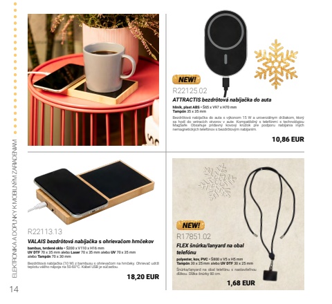 14ELEKTRONIKA A DOPLNKY K MOBILN%u00ddM ZARIADENIAMNEW!NEW!R22113.13VALAIS bezdr%u00f4tov%u00e1 nab%u00edja%u010dka s ohrieva%u010dom hrn%u010dekovbambus, tvrden%u00e9 sklo %u2022 %u0160200 x V110 x H16 mmUV DTF 70 x 35 mm alebo Laser 70 x 35 mm alebo UV 70 x 35 mmalebo Tamp%u00f3n 70 x 30 mmBezdr%u00f4tov%u00e1 nab%u00edja%u010dka (10 W) z bambusu s ohrieva%u010dom na hrn%u010deky. Ohrieva%u010d udr%u017e%u00ed teplotu v%u00e1%u0161ho n%u00e1poja na 50-60%u00b0C. K%u00e1bel USB je s%u00fa%u010das%u0165ou.18,20 EURR22125.02ATTRACTIS bezdr%u00f4tov%u00e1 nab%u00edja%u010dka do autahlin%u00edk, plast ABS %u2022 %u016065 x V97 x H70 mmTamp%u00f3n 35 x 35 mmBezdr%u00f4tov%u00e1 nab%u00edja%u010dka do auta s v%u00fdkonom 15 W a univerz%u00e1lnym dr%u017eiakom, ktor%u00fd sa hod%u00ed do vetrac%u00edch otvorov v aute. Kompatibiln%u00fd s telef%u00f3nmi s technol%u00f3giou MagSafe. Obsahuje pr%u00eddavn%u00fd kovov%u00fd kr%u00fa%u017eok pre podporu nab%u00edjania in%u00fdch nemagnetick%u00fdch telef%u00f3nov s bezdr%u00f4tov%u00fdm nab%u00edjan%u00edm.10,86 EURR17851.02FLEX %u0161n%u00farka/lanyard na obal telef%u00f3nupolyester, kov, PVC %u2022 %u0160800 x V5 x H5 mmTamp%u00f3n 30 x 25 mm alebo UV DTF 30 x 25 mm%u0160n%u00farka/lanyard na obal telef%u00f3nu s nastavite%u013enou d%u013a%u017ekou. D%u013a%u017eka %u0161n%u00farky 80 cm.1,68 EUR