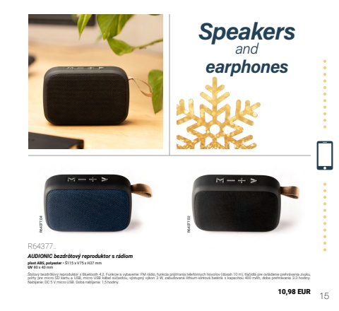 15R64377.04 R64377.02Speakers andearphonesR64377..AUDIONIC bezdr%u00f4tov%u00fd reproduktor s r%u00e1diomplast ABS, polyester %u2022 %u0160115 x V75 x H37 mmUV 80 x 40 mm%u0160t%u00fdlov%u00fd bezdr%u00f4tov%u00fd reproduktor s Bluetooth 4.2. Funkcie a vybavenie: FM r%u00e1dio, funkcia prij%u00edmania telef%u00f3nnych hovorov (dosah 10 m), tla%u010didl%u00e1 pre ovl%u00e1danie prehr%u00e1vania zvuku, porty pre micro SD kartu a USB, micro USB k%u00e1bel s%u00fa%u010das%u0165ou, v%u00fdstupn%u00fd v%u00fdkon 3 W, zabudovan%u00e1 l%u00edthium-iontov%u00e1 bat%u00e9ria s kapacitou 400 mAh, doba prehr%u00e1vania 2-3 hodiny. Nab%u00edjanie: DC 5 V micro USB. Doba nab%u00edjania: 1,5 hodiny.10,98 EUR