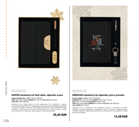 158KANCEL%u00c1RIAR02324.02DENVER dar%u010dekov%u00fd set flash disku, z%u00e1pisn%u00edku a perapapier, bambus, kov %u2022 %u0160260 x V210 x H30 mmLaser 40 x 20 mm alebo Tamp%u00f3n 40 x 20 mm alebo UV 40 x 20 mmalebo DTF 150 x 200 mmDar%u010dekov%u00fd set s flash diskom 64 GB, z%u00e1pisn%u00edkom A5 s prebalom z tkaniny z recyklovan%u00e9ho PET (RPET) a s gu%u013e%u00f4%u010dkov%u00fdm perom. Z%u00e1pisn%u00edk s 80 linajkov%u00fdmi listami (70 g/m%u00b2) a s p%u00fatkom na pero. Tvrd%u00e9 dosky z%u00e1pisn%u00edku je mo%u017en%u00e9 upravi%u0165 ako stojan na telef%u00f3n. Gu%u013e%u00f4%u010dkov%u00e9 pero z hlin%u00edku s matn%u00fdm povrchom a modrou n%u00e1pl%u0148ou. V%u0161etky %u010dasti maj%u00fa povrch z bambusu. Set je balen%u00fd v dar%u010dekovej krabi%u010dke.25,45 EURR02323.02NEBRASKA dar%u010dekov%u00fd set z%u00e1pisn%u00edku, pera a pr%u00edveskuPU, kov, papier %u2022 %u0160260 x V210 x H30 mmkrabi%u010dka 260 x 210 x 30 mm, z%u00e1pisn%u00edk 145 x 210 x 13 mm, pero 130 x 10 x 10 mm, pr%u00edvesok 80 x 30 x 7 mmLaser 40 x 6 mm alebo Tamp%u00f3n 60 x 50 mm alebo UV 150 x 200 mmalebo Razba 50 x 20 mmDar%u010dekov%u00fd set so z%u00e1pisn%u00edkom A5, gu%u013e%u00f4%u010dkov%u00fdm perom a pr%u00edveskom na k%u013e%u00fa%u010de. Z%u00e1pisn%u00edk s tvrd%u00fdmi doskami, 80 linajkov%u00fdch listov (70 g/m%u00b2). Gu%u013e%u00f4%u010dkov%u00e9 pero s modrou n%u00e1pl%u0148ou. V%u0161etky %u010dasti maj%u00fa povrch z eko ko%u017ee (PU). Set je balen%u00fd v %u010diernej dar%u010dekovej krabi%u010dke.14,28 EUR