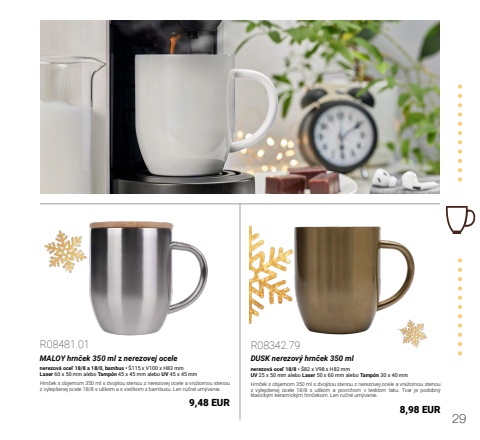 29R08481.01MALOY hrn%u010dek 350 ml z nerezovej ocelenerezov%u00e1 oce%u013e 18/8 a 18/0, bambus %u2022 %u0160115 x V100 x H83 mmLaser 60 x 50 mm alebo Tamp%u00f3n 45 x 45 mm alebo UV 45 x 45 mmHrn%u010dek s objemom 350 ml s dvojitou stenou z nerezovej ocele a vn%u00fatornou stenou z vylep%u0161enej ocele 18/8 s u%u0161kom a s vie%u010dkom z bambusu. Len ru%u010dn%u00e9 um%u00fdvanie.9,48 EURR08342.79DUSK nerezov%u00fd hrn%u010dek 350 mlnerezov%u00e1 oce%u013e 18/8 %u2022 %u016082 x V98 x H82 mmUV 25 x 50 mm alebo Laser 50 x 60 mm alebo Tamp%u00f3n 30 x 40 mmHrn%u010dek s objemom 350 ml s dvojitou stenou z nerezovej ocele a vn%u00fatornou stenou z vylep%u0161enej ocele 18/8 s u%u0161kom a povrchom v lesklom laku. Tvar je podobn%u00fd klasick%u00fdm keramick%u00fdm hrn%u010dekom. Len ru%u010dn%u00e9 um%u00fdvanie.8,98 EUR