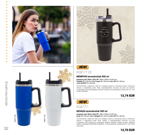 32V%u0160ETKO PRE N%u00c1POJENEW!R08777.04 R08777.06NEW!R08177.02MEMPHIS termohrn%u010dek 900 mlnerezov%u00e1 oce%u013e 18/8 a 18/0, PP %u2022 %u016090 x V240 x H135 mmTamp%u00f3n 30 x 30 mm alebo Laser 50 x 50 mm alebo UV 25 x 90 mmalebo UV DTF 25 x 90 mmTermohrn%u010dek s objemom 900 ml s dvojitou stenou z nerezovej ocele, vn%u00fatornou stenou z vylep%u0161enej ocele 18/8, uzatv%u00e1rate%u013en%u00fdm otvorom na pitie cez slamku a rukov%u00e4%u0165ou pre pohodlnej%u0161ie dr%u017eanie hrn%u010deku.Termoizola%u010dn%u00e1 schopnos%u0165 6 h. Len ru%u010dn%u00e9 um%u00fdvanie.13,74 EURR08777..NEVADA termohrn%u010dek 900 mlnerezov%u00e1 oce%u013e 18/8 a 18/0, PP %u2022 %u016090 x V240 x H135 mmLaser 50 x 60 mm alebo Tamp%u00f3n 30 x 30 mm alebo UV 25 x 90 mmTermohrn%u010dek s objemom 900 ml s dvojitou stenou z nerezovej ocele a vn%u00fatornou stenou z vylep%u0161enej ocele 18/8. Vie%u010dko s uzatv%u00e1rate%u013en%u00fdm otvorom na pitie a slamkou. M%u00e1 rukov%u00e4%u0165 pre pohodln%u00e9 dr%u017eanie hrn%u010deku. V%u010faka svojmu ve%u013ek%u00e9mu objemu zabezpe%u010d%u00ed dlhodob%u00fa hydrat%u00e1ciu. Termoizola%u010dn%u00e1 schopnos%u0165 6 h. Len ru%u010dn%u00e9 um%u00fdvanie.13,70 EUR