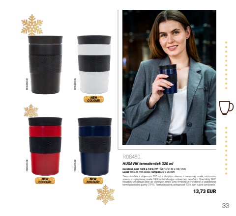 33R08480.02 R08480.06 R08480.08 R08480.42NEWCOLOUR!NEWCOLOUR!NEWCOLOUR!R08480..HUSAVIK termohrn%u010dek 320 mlnerezov%u00e1 oce%u013e 18/8 a 18/0, PP %u2022 %u016087 x V140 x H87 mmLaser 50 x 25 mm alebo Tamp%u00f3n 30 x 25 mmTermohrn%u010dek s objemom 320 ml s dvojitou stenou z nerezovej ocele, vn%u00fatornou stenou z vylep%u0161enej ocele 18/8 a tla%u010didlov%u00fdm uz%u00e1verom, nete%u010d%u00faci. %u0160peci%u00e1lny 360%u00b0 n%u00e1ustok umo%u017e%u0148uje pitie zo v%u0161etk%u00fdch str%u00e1n. Dno hrn%u010deka je vyroben%u00e9 z vodotesnej termoplastickej gumy (TPR). Termoizola%u010dn%u00e1 schopnos%u0165 12 h. Len ru%u010dn%u00e9 um%u00fdvanie.13,73 EUR