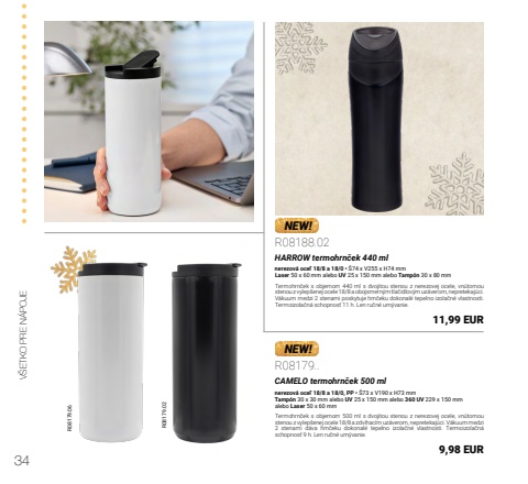 34V%u0160ETKO PRE N%u00c1POJER08179.02 R08179.06R08188.02HARROW termohrn%u010dek 440 mlnerezov%u00e1 oce%u013e 18/8 a 18/0 %u2022 %u016074 x V255 x H74 mmLaser 50 x 60 mm alebo UV 25 x 150 mm alebo Tamp%u00f3n 30 x 80 mmTermohrn%u010dek s objemom 440 ml s dvojitou stenou z nerezovej ocele, vn%u00fatornou stenou z vylep%u0161enej ocele 18/8 aobojsmern%u00fdm tla%u010didlov%u00fdm uz%u00e1verom, nepretekaj%u00faci. V%u00e1kuum medzi 2 stenami poskytuje hrn%u010deku dokonal%u00e9 tepelno izola%u010dn%u00e9 vlastnosti. Termoizola%u010dn%u00e1 schopnos%u0165 11 h. Len ru%u010dn%u00e9 um%u00fdvanie.11,99 EURR08179..CAMELO termohrn%u010dek 500 mlnerezov%u00e1 oce%u013e 18/8 a 18/0, PP %u2022 %u016073 x V190 x H73 mmTamp%u00f3n 30 x 30 mm alebo UV 25 x 150 mm alebo 360 UV 229 x 150 mmalebo Laser 50 x 60 mmTermohrn%u010dek s objemom 500 ml s dvojitou stenou z nerezovej ocele, vn%u00fatornou stenou z vylep%u0161enej ocele 18/8 a zdv%u00edhac%u00edm uz%u00e1verom, nepretekaj%u00faci. V%u00e1kuum medzi 2 stenami d%u00e1va hrn%u010deku dokonal%u00e9 tepelno izola%u010dn%u00e9 vlastnosti. Termoizola%u010dn%u00e1 schopnos%u0165 9 h. Len ru%u010dn%u00e9 um%u00fdvanie.9,98 EURNEW!NEW!