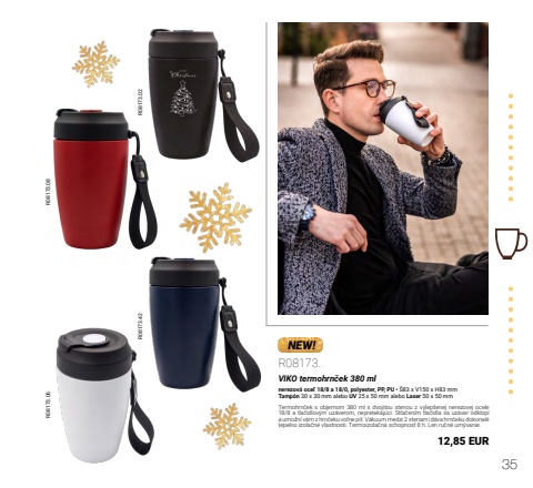 35R08173.08R08173.42 R08173.02R08173.06R08173..VIKO termohrn%u010dek 380 mlnerezov%u00e1 oce%u013e 18/8 a 18/0, polyester, PP, PU %u2022 %u016083 x V150 x H83 mmTamp%u00f3n 30 x 30 mm alebo UV 25 x 50 mm alebo Laser 50 x 50 mmTermohrn%u010dek s objemom 380 ml s dvojitou stenou z vylep%u0161enej nerezovej ocele 18/8 a tla%u010didlov%u00fdm uz%u00e1verom, nepretekaj%u00faci. Stla%u010den%u00edm tla%u010didla sa uz%u00e1ver odklop%u00ed a umo%u017en%u00ed v%u00e1m z hrn%u010deku vo%u013ene pi%u0165. V%u00e1kuum medzi 2 stenami d%u00e1va hrn%u010deku dokonal%u00e9 tepelno izola%u010dn%u00e9 vlastnosti. Termoizola%u010dn%u00e1 schopnos%u0165 8 h. Len ru%u010dn%u00e9 um%u00fdvanie.12,85 EURNEW!