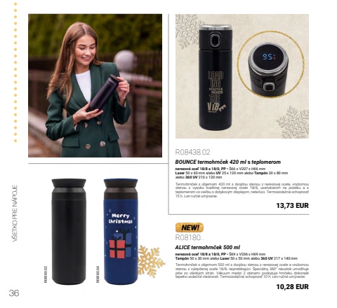 36V%u0160ETKO PRE N%u00c1POJER08180.02 R08180.04R08438.02BOUNCE termohrn%u010dek 420 ml s teplomeromnerezov%u00e1 oce%u013e 18/8 a 18/0, PP %u2022 %u016066 x V207 x H66 mmLaser 50 x 60 mm alebo UV 25 x 120 mm alebo Tamp%u00f3n 30 x 80 mmalebo 360 UV 210 x 120 mmTermohrn%u010dek s objemom 420 ml s dvojitou stenou z nerezovej ocele, vn%u00fatornou stenou z vysoko kvalitnej nerezovej ocele 18/8, uzatv%u00e1ran%u00edm na poistku a s teplomerom vo vie%u010dku s dotykov%u00fdm displejom, nete%u010d%u00faci. Termoizola%u010dn%u00e1 schopnos%u0165 15 h. Len ru%u010dn%u00e9 um%u00fdvanie.13,73 EURR08180..ALICE termohrn%u010dek 500 mlnerezov%u00e1 oce%u013e 18/8 a 18/0, PP %u2022 %u016069 x V206 x H69 mmTamp%u00f3n 50 x 30 mm alebo Laser 50 x 50 mm alebo 360 UV 217 x 140 mmTermohrn%u010dek s objemom 500 ml s dvojitou stenou z nerezovej ocele a vn%u00fatornou stenou z vylep%u0161enej ocele 18/8, nepretekaj%u00faci. %u0160peci%u00e1lny 360%u00b0 n%u00e1ustok umo%u017e%u0148uje pitie zo v%u0161etk%u00fdch str%u00e1n. V%u00e1kuum medzi 2 stenami poskytuje hrn%u010deku dokonal%u00e9 tepelno izola%u010dn%u00e9 vlastnosti. Termoizola%u010dn%u00e1 schopnos%u0165 10 h. Len ru%u010dn%u00e9 um%u00fdvanie.10,28 EURNEW!