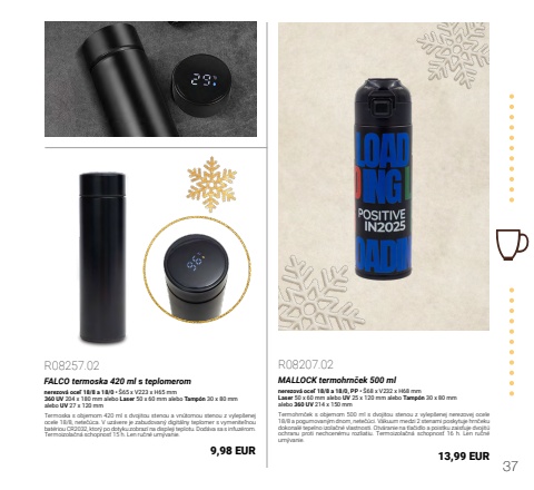 37R08257.02FALCO termoska 420 ml s teplomeromnerezov%u00e1 oce%u013e 18/8 a 18/0 %u2022 %u016065 x V223 x H65 mm360 UV 204 x 180 mm alebo Laser 50 x 60 mm alebo Tamp%u00f3n 30 x 80 mmalebo UV 27 x 120 mmTermoska s objemom 420 ml s dvojitou stenou a vn%u00fatornou stenou z vylep%u0161enej ocele 18/8, nete%u010d%u00faca. V uz%u00e1vere je zabudovan%u00fd digit%u00e1lny teplomer s vymenite%u013enou bat%u00e9riou CR2032, ktor%u00fd po dotyku zobraz%u00ed na displeji teplotu. Dod%u00e1va sa s infuz%u00e9rom. Termoizola%u010dn%u00e1 schopnos%u0165 15 h. Len ru%u010dn%u00e9 um%u00fdvanie.9,98 EURR08207.02MALLOCK termohrn%u010dek 500 mlnerezov%u00e1 oce%u013e 18/8 a 18/0, PP %u2022 %u016068 x V232 x H68 mmLaser 50 x 60 mm alebo UV 25 x 120 mm alebo Tamp%u00f3n 30 x 80 mmalebo 360 UV 214 x 150 mmTermohrn%u010dek s objemom 500 ml s dvojitou stenou z vylep%u0161enej nerezovej ocele 18/8 a pogumovan%u00fdm dnom, nete%u010d%u00faci. V%u00e1kuum medzi 2 stenami poskytuje hrn%u010deku dokonal%u00e9 tepelno izola%u010dn%u00e9 vlastnosti. Otv%u00e1ranie na tla%u010didlo a poistku zais%u0165uje dvojit%u00fa ochranu proti nechcen%u00e9mu rozliatiu. Termoizola%u010dn%u00e1 schopnos%u0165 16 h. Len ru%u010dn%u00e9 um%u00fdvanie.13,99 EUR