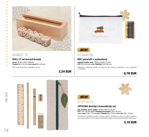 74PRE DETINEW!R08837.10ROLL-IT set hrac%u00edch kociekdrevo %u2022 %u0160100 x V32 x H28 mmTamp%u00f3n 60 x 15 mm alebo Laser 85 x 20 mmSet 5 hrac%u00edch kociek v krabi%u010dke z dreva.2,24 EURR73640.06MILI pera%u010dn%u00edk s voskovkaminetkan%u00e1 text%u00edlia, vosk %u2022 %u0160220 x V140 x H1 mmDTF 150 x 80 mm alebo Sie%u0165otla%u010d 150 x 80 mmPera%u010dn%u00edk z netkanej text%u00edlie, na ktor%u00fd sa d%u00e1 ma%u013eova%u0165. S%u00fa%u010das%u0165ou je set voskoviek v 5 farb%u00e1ch.0,78 EURNEW!R73714.13OFFICINA %u0161kolsk%u00fd a kancel%u00e1rsky setjuta, bambus, guma, papier %u2022 %u0160190 x V80 x H10 mmDTF 120 x 50 mm alebo Sie%u0165otla%u010dov%u00fd transfer 120 x 50 mmalebo Laser 140 x 15 mm alebo Tamp%u00f3n 90 x 15 mm alebo UV 140 x 15 mmSet p%u00edsac%u00edch potrieb v puzdre z juty so zipsom. Sklad%u00e1 sa z pera s modrou n%u00e1pl%u0148ou, ceruzky, prav%u00edtka (15 cm), gumy astr%u00fahatka. V%u0161etko vyroben%u00e9 zpr%u00edrodn%u00fdch materi%u00e1lov.3,10 EUR