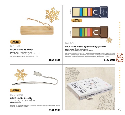 75NEW!NEW!R73670.42 R73670.13NEWCOLOUR!R73128.13PAGIA z%u00e1lo%u017eka do kni%u017ekybambus, juta %u2022 %u0160120 x V30 x H2 mmLaser 90 x 20 mm alebo Tamp%u00f3n 90 x 20 mmZ%u00e1lo%u017eka do kni%u017eky z kovu so %u0161pag%u00e1tikom z juty.0,56 EURR73670..BOOKMARK z%u00e1lo%u017eka s prav%u00edtkom a papierikmipapier, kart%u00f3n %u2022 %u0160210 x V67 x H2 mmTamp%u00f3n 100 x 25 mm alebo DTF 50 x 35 mmZ%u00e1lo%u017eka s prav%u00edtkom (13 cm / 5\papier z recyklovan%u00fdch materi%u00e1lov (500 g/m%u00b2). Obsahuje 15 ks %u017elt%u00fdch lepiacich papierikov (75 g/m%u00b2) a 5 x 15 ks farebn%u00fdch lepiacich ozna%u010dova%u010dov 75 g/m%u00b2.0,39 EURR73129.01LIBRO z%u00e1lo%u017eka do kni%u017ekynerezov%u00e1 oce%u013e, kart%u00f3n %u2022 %u0160140 x V30 x H3 mmLaser 15 x 7 mmZ%u00e1lo%u017eka do kni%u017eky z kovu s pr%u00edveskom s plochou na grav%u00edrovanie loga. Balen%u00e9 v %u010diernej dar%u010dekovej krabi%u010dke.2,82 EUR