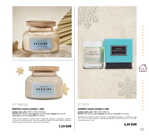 91R17440.06MATALA vonn%u00e1 svie%u010dka v skleparaf%u00edn, drevo, sklo %u2022 %u0160125 x V100 x H125 mmUV DTF 100 x 25 mm alebo Laser 60 x 50 mm alebo Tamp%u00f3n 50 x 50 mmalebo UV 65 x 65 mm alebo DTF 65 x 65 mmVe%u013ek%u00e1 vonn%u00e1 svie%u010dka s v%u00f4%u0148ou mora v sklenenej n%u00e1dobe s dreven%u00fdm vie%u010dkom. Jemn%u00e1 a osvie%u017euj%u00faca v%u00f4%u0148a mora v%u00e1s pr%u00edjemne nalad%u00ed a umo%u017en%u00ed k%u013eudn%u00fa relax%u00e1ciu. Doba horenia cca. 80 hod%u00edn. Hmotnos%u0165 vosku 480 g.7,24 EURR17479CANDLE vonn%u00e1 svie%u010dka v skleparaf%u00edn, kart%u00f3n, sklo %u2022 %u016085 x V90 x H85 mmUV DTF 100 x 50 mm alebo Tamp%u00f3n 40 x 40 mm alebo UV 70 x 70 mmParf%u00e9movan%u00e1 svie%u010dka s v%u00f4%u0148ou jasm%u00ednu a gran%u00e1tov%u00e9ho jablka v n%u00e1dobke zo skla (70 x 84 x 70 mm). Balen%u00e1 v dar%u010dekovej krabi%u010dke. Doba horenia cca. 25 hod%u00edn. Hmotnos%u0165 vosku 125 g.6,49 EUR