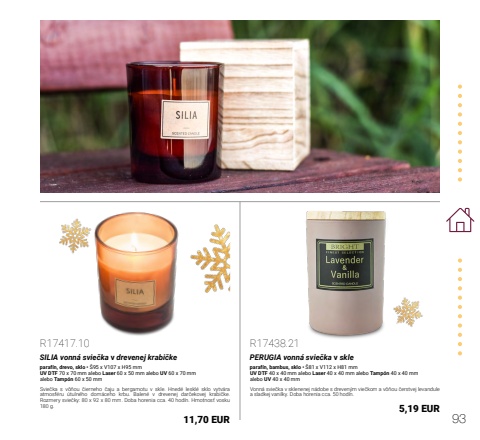 93R17417.10SILIA vonn%u00e1 svie%u010dka v drevenej krabi%u010dkeparaf%u00edn, drevo, sklo %u2022 %u016095 x V107 x H95 mmUV DTF 70 x 70 mm alebo Laser 60 x 50 mm alebo UV 60 x 70 mmalebo Tamp%u00f3n 60 x 50 mmSvie%u010dka s v%u00f4%u0148ou %u010dierneho %u010daju a bergamotu v skle. Hned%u00e9 leskl%u00e9 sklo vytv%u00e1ra atmosf%u00e9ru %u00fatuln%u00e9ho dom%u00e1ceho krbu. Balen%u00e9 v drevenej dar%u010dekovej krabi%u010dke. Rozmery svie%u010dky: 80 x 92 x 80 mm. Doba horenia cca. 40 hod%u00edn. Hmotnos%u0165 vosku 180 g.11,70 EURR17438.21PERUGIA vonn%u00e1 svie%u010dka v skleparaf%u00edn, bambus, sklo %u2022 %u016081 x V112 x H81 mmUV DTF 40 x 40 mm alebo Laser 40 x 40 mm alebo Tamp%u00f3n 40 x 40 mmalebo UV 40 x 40 mmVonn%u00e1 svie%u010dka v sklenenej n%u00e1dobe s dreven%u00fdm vie%u010dkom a v%u00f4%u0148ou %u010derstvej levandule a sladkej vanilky. Doba horenia cca. 50 hod%u00edn.5,19 EUR
