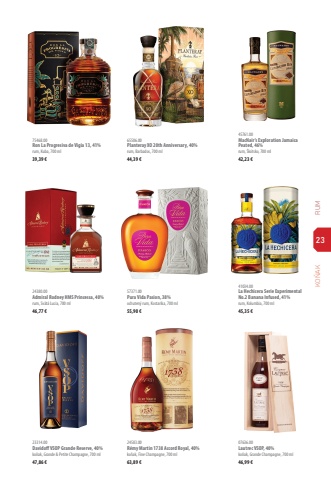 23RUM KO%u0147AK65506.00Planteray XO 20th Anniversary, 40%rum, Barbados, 700 ml44,39 %u20ac24380.00Admiral Rodney HMS Princessa, 40%rum, Sv%u00e4t%u00e1 Lucia, 700 ml46,77 %u20ac23314.00Davido%u0016 VSOP Grande Reserve, 40%ko%u0148ak, Grande & Petite Champagne, 700 ml47,86 %u20ac57371.00Pura Vida Pasion, 38%ochuten%u00fd rum, Kostarika, 700 ml55,90 %u20ac24583.00R%u00e9my Martin 1738 Accord Royal, 40%ko%u0148ak, Fine Champagne, 700 ml63,89 %u20ac45761.00MacNair%u2019s Exploration Jamaica Peated, 46%rum, %u0160k%u00f3tsko, 700 ml42,23 %u20ac41034.00La Hechicera Serie Experimental No.2 Banana Infused, 41%rum, Kolumbia, 700 ml45,35 %u20ac07636.00Lautrec VSOP, 40%ko%u0148ak, Grande Champagne, 700 ml46,99 %u20ac75468.00Ron La Progresiva de Vigia 13, 41%rum, Kuba, 700 ml39,39 %u20ac