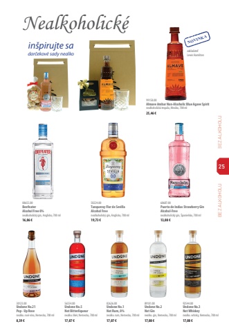 25BEZ ALKOHOLU BEZ ALKOHOLU30123.00Undone No.21 Pop - Up Rosenealko. ros%u00e9 v%u00edno, Nemecko, 700 ml8,39 %u20ac08655.00Beefeater Alcohol Free 0%nealkoholick%u00fd gin, Anglicko, 700 ml16,06 %u20ac82626.00Undone No.1 Not Rum, 0%nealko.%u00a0rum, Nemecko, 700 ml17,07 %u20ac56554.00Undone No.5 Not Bitterliqueurnealko. lik%u00e9r, Nemecko, 700 ml17,07 %u20ac50224.00Tanqueray Flor de SevillaAlcohol Freenealkoholick%u00fd gin, Anglicko, 700 ml19,73 %u20ac89181.00Undone No.2 Not Ginnealko. gin, Nemecko, 700 ml17,08 %u20ac99158.00Almave Ambar Non-Alcoholic Blue Agave Spiritnealkoholick%u00e1 tequila, Mexiko, 700 ml25,46 %u20ac60607.00Puerto de Indias Strawberry Gin Alcohol-Freenealkoholick%u00fd gin, %u0160panielsko, 700 ml13,08 %u20ac92544.00Undone No.3 Not Whiskeynealko. whisky, Nemecko, 700 ml17,08 %u20acNOVINKANealkoholick%u00e9zakladate%u013e Lewis Hamiltonin%u0161pirujte sadar%u010dekov%u00e9 sady nealko