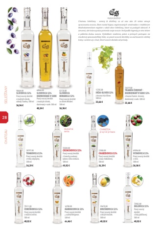 28 SELE%u0160%u0164ANY CHATEAU98664.00SLIVOVICA 52%Prav%u00fd ovocn%u00fd destil%u00e1t z modr%u00fdch sliviek, odrody Stanley. 500 ml36,96 %u20ac02138.00SLIVOVICA MIRABELA 52%Prav%u00fd ovocn%u00fd destil%u00e1t zo sliviek Mirabel. 500 ml36,96 %u20ac60968.00SLIVOVICA 52% DOZRIEVAN%u00c1 V%u00a0SUDEPrav%u00fd ovocn%u00fd destil%u00e1t z modr%u00fdch sliviek, dozrievan%u00fd v sude. 500 ml40,24 %u20ac15785.00IR%u0160AI OLIVER 52%z hrozna Ir%u0161ai Oliver. 500 ml33,66 %u20ac56619.00TRAM%u00cdN %u010cERVEN%u00dd - DOZRIEVAN%u00dd V SUDE 52%z hrozna Tram%u00edn %u010derven%u00fd, dozrievan%u00fd v sude. 500 ml33,66 %u20acChateau Sele%u0161%u0165any - winery & distillery sa u%u017e viac ako 25 rokov venuje spracovaniu ovocia. Zlom nastal k%u00fapou registrovan%u00fdch vinohradov v malebnom Modrokamenskom regi%u00f3ne v okol%u00ed obce Sele%u0161%u0165any, ktor%u00e9 sa podujali obnovi%u0165. A %u00famorn%u00e1, ale kr%u00e1sna pr%u00e1ca priniesla svoje ovocie. Ve%u010f pod%u013ea legendy je v%u00edno telom a p%u00e1lenka du%u0161ou ovocia. V%u00fdsledkom sna%u017eenia, pr%u00e1ce a pr%u00edsnych postupov na modernej spracovate%u013eskej linke, s%u00fa prav%u00e9 ovocn%u00e9 destil%u00e1ty so zachovan%u00edm v%u0161etkej kr%u00e1sy v ar%u00f3me aj v chuti, ktor%u00e9 ovocie dostalo od pr%u00edrody. 79311.00%u010cERE%u0160%u0147OVICA 52%Prav%u00fd ovocn%u00fd destil%u00e1t z vt%u00e1%u010d%u00edch %u010dere%u0161n%u00ed. 500 ml49,92 %u20ac28797.00TRNKOVICA 52%Prav%u00fd ovocn%u00fd destil%u00e1t z trnky oby%u010dajnej. 500 ml56,39 %u20ac69996.00VI%u0160NOVICA 52%Prav%u00fd ovocn%u00fd destil%u00e1t z vi%u0161n%u00ed. 500 ml36,96 %u20ac10788.00MARHU%u013dOVICA 52%Prav%u00fd ovocn%u00fd destil%u00e1t z marh%u00fa%u013e Bergeron. 500 ml44,46 %u20ac10788.00MARHU%u013dOVICA 52%Prav%u00fd ovocn%u00fd destil%u00e1t z marh%u00fa%u013e Bergeron. 500 ml44,46 %u20ac39670.00HRU%u0160KOVICA 52%Prav%u00fd ovocn%u00fd destil%u00e1t z div%u00fdch hru%u0161iek. 500 ml49,92 %u20ac73982.00DULOVICA 52%Prav%u00fd ovocn%u00fd destil%u00e1t z Duly jab%u013a%u010dkovej. 500 ml49,92 %u20ac72908.00CHABZDOVICA 52%Prav%u00fd ovocn%u00fd destil%u00e1t z bazy chabzdovej. 500 ml56,39 %u20ac72908.00CHABZDOVICA 52%Prav%u00fd ovocn%u00fd destil%u00e1t z bazy chabzdovej. 500 ml56,39 %u20ac54384.00%u010cREMCHOVICA 52%Prav%u00fd ovocn%u00fd destil%u00e1t z %u010dremchy neskorej %u013eudovo vi%u0161%u0148a neskor%u00e1. 500 ml49,92 %u20ac54384.00%u010cREMCHOVICA 52%Prav%u00fd ovocn%u00fd destil%u00e1t z %u010dremchy neskorej %u013eudovo vi%u0161%u0148a neskor%u00e1. 500 ml49,92 %u20acskuto%u010dn%u00e1 raritaCHABZDAje aj nie je baza