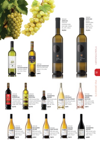 31KARPATSK%u00c1 PERLA SLOVENSK%u00c9 V%u00cdNA29112.00FRANKOVKA MODR%u00c1 MVO, %u010derven%u00e9 such%u00e9, cukornatos%u0165 19%u00b0NM, 2022, 750 ml6,48 %u20ac61934.00RIZLING R%u00ddNSKYMVO, biele such%u00e9, cukornatos%u0165 21%u00b0NM,2024, 750 ml.*7,61 %u20ac91434.00PINOT BLANCMVO, biele such%u00e9, cukornatos%u0165 22%u00b0NM, 2024, 750 ml.*7,61 %u20ac63482.00BOBULO BIELE BIO100% hroznov%u00e1 %u0161%u0165ava z bielych odr%u00f4d Veltl%u00ednske zelen%u00e9 a Pinot Blanc, 2024, 750 ml4,71 %u20ac18019.00FRIZZANTE RIZLING R%u00ddNSKY%u00a0MVO, biele polosuch%u00e9, alkohol 12%, 2024, 750 ml.*7,61%u20ac05194.00FRANKOVKA MODR%u00c1 ROS%u00c9 BIOMVO, ru%u017eov%u00e9 such%u00e9, cukornatos%u0165 21%u00b0NM, 2024, 750 ml.*7,61 %u20ac00346.00AURELIUSSuch%u00fd vrch, hrozienkov%u00fd v%u00fdber, biele sladk%u00e9, alkohol 8%, 2019, 500 ml19,72 %u20ac45453.00BOBULO RU%u017dOV%u00c9 BIO100% hroznov%u00e1 %u0161%u0165ava z modr%u00fdch odr%u00f4d Andr%u00e9 a Frankovka modr%u00e1, 2024, 750 ml4,71 %u20ac96342.00VELTL%u00cdNSKE ZELEN%u00c9 MVO, biele such%u00e9, cukornatos%u0165 22%u00b0NM, 2024, 750 ml.*5,92 %u20ac85085.00SVETOV%u00c9 NOVINYcuve%u00e9 biele, alkohol 12%, 2023, 750 ml9,86 %u20ac54077.00MU%u0160K%u00c1T MORAVSK%u00ddSuch%u00fd vrch, biele such%u00e9, alkohol 11,5%, 2024, 750 ml6,48 %u20ac61057.00MU%u0160K%u00c1T MORAVSK%u00ddMVO, biele such%u00e9, cukornatos%u0165 19%u00b0NM, 2024, 750 ml.*7,61 %u20ac24773.00FRANKOVKA MODR%u00c1%u00a0MVO, %u010derven%u00e9 such%u00e9, alkohol 13%, 2021, 250 ml. Min. obj.: 24 ks2,82 %u20ac38698.00DEV%u00cdN BIOKalv%u00e1ria, bobu%u013eov%u00fd v%u00fdber, biele sladk%u00e9, alkohol 12,5%, 2023, 500 ml11,55 %u20ac