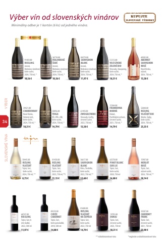 33587.00CABERNET FRANCTajn%u00e1, Sari, %u010derven%u00e9 such%u00e9, 2021, 750 ml23,90 %u20ac52848.00RIZLING VLA%u0160SK%u00dd%u00a0BIOModra, %u0160ajby, biele such%u00e9, 2024, 750 ml, *25,35 %u20ac09229.00CUV%u00c9E CABERNETTajn%u00e1, Sari, biele polosladk%u00e9, 2018, 500 ml14,08 %u20ac61493.00ZWEIGELTREBEVinosady, Grefty, %u010derven%u00e9 such%u00e9, 2022, 750 ml, *13,38 %u20ac01450.00RIZLING VLA%u0160SK%u00ddTajn%u00e1, Sari, biele such%u00e9, 2023, 750 ml,**l11,13 %u20ac36617.00SAUVIGNON BLANCNitra, %u0160indolka, biele such%u00e9,2022, 750 ml,**12,68 %u20ac68747.00RIESLINGTajn%u00e1, Sari, biele sladk%u00e9, 2022, 500 ml11,97 %u20ac50096.00TRIGAR%u0160+P%u00c1L+RB, biele such%u00e9, 2024, 750 ml, *14,79 %u20ac01608.00RIZLING VLA%u0160SK%u00dd NA %u0160UP%u00c1CHTajn%u00e1, Sari, biele such%u00e9,2022, 750 ml14,79 %u20ac39421.00CHARDONNAYNov%u00e1 Vieska, Vetern%u00fd vrch, biele such%u00e9, 2024, 750 ml, *18,31 %u20ac15907.00MERLOT ROS%u00c9Tajn%u00e1, Sari, ru%u017eov%u00e9 such%u00e9, 2024, 750 ml,**10,14 %u20ac50445.00RIZLING VLA%u0160SK%u00ddTajn%u00e1, Sari, biele such%u00e9, 2024, 750 ml, **8,73 %u20acMinim%u00e1lny odber je 1 kart%u00f3n (6 ks) od jedn%u00e9ho vin%u00e1ra.V%u00fdber v%u00edn od slovensk%u00fdch vin%u00e1rovSLOVENSK%u00c9 V%u00cdNA V%u00ddBER3436710.00RULANDSK%u00c9 %u0160ED%u00c9Jasov%u00e1, Moln%u00e1rov vinohrad, biele such%u00e9, 2024, 750 ml, *10,56 %u20ac91459.00RIESLINGJasov%u00e1, Moln%u00e1rov vinohrad, biele such%u00e9, 2024, 750 ml, *10,56 %u20ac19792.00DUNAJTajn%u00e1, Sari, %u010derven%u00e9 such%u00e9, 2023, 750 ml18,31 %u20ac15384.00FRANKOVKA MODR%u00c1R%u00faba%u0148, Pod Mal%u00fdm vrchom, %u010derven%u00e9 such%u00e9, 2021, 750 ml, *14,79 %u20ac63570.00PINOT BLANC SUR LIETajn%u00e1, Sari, biele such%u00e9, 2020, 750 ml14,08 %u20ac69305.00ABERNET SAUVIGNON ROS%u00c9Nov%u00e1 Vieska, ru%u017eov%u00e9,2024, 750 ml, *13,38 %u20ac51213.00VELTL%u00cdNSKE ZELEN%u00c9 BIOVinosady, Hauspereg, biele such%u00e9, 2024, 750 ml, *18,31 %u20ac04279.00SAUVIGNON BLANCJasov%u00e1, Moln%u00e1rov vinohrad, biele such%u00e9, 2024, 750 ml, *11,97 %u20ac** n%u00edzkohistam%u00ednov%u00e9 v%u00edno *veg%u00e1nske a n%u00edzkohistam%u00ednov%u00e9 v%u00edno