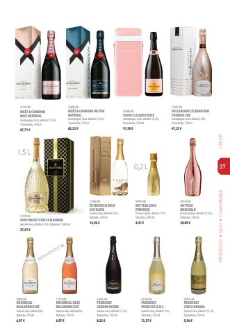 78933.00FREIXENET CARTA NEVADA%u0161umiv%u00e9 v%u00edno, alkohol 11,5%, %u0160panielsko, 750 ml9,56 %u20ac67189.00FREIXENET PROSECCO D.O.C.%u0161umiv%u00e9 v%u00edno, alkohol 11%, Taliansko, 750 ml13,37 %u20ac35892.00FREIXENET CORDON NEGRO%u0161umiv%u00e9 v%u00edno, alkohol 11,5%, %u0160panielsko, 750 ml8,25 %u20ac57895.00VOLLEREAUX C%u00c9L%u00c9BRATION PREMIER CRUchampagne, brut, alkohol 12%, Franc%u00fazsko, 750 ml47,25 %u20ac77274.00HOCHRIEGL ROS%u00c9 NEALKOHOLICK%u00c9%u0161umiv%u00e9 v%u00edno, alkohol 0%, Rak%u00fasko, 750 ml6,97 %u20ac38754.00BOTTEGA ROSE GOLDProsecco Brut, alkohol 11,5%, Taliansko, 750 ml20,89 %u20ac67960.00VEUVE CLICQUOT ROS%u00c9champagne, brut, alkohol 12,5%, Franc%u00fazsko, 750 ml91,50 %u20ac49092.00HOCHRIEGL NEALKOHOLICK%u00c9%u0161umiv%u00e9 v%u00edno, alkohol 0%, Rak%u00fasko, 750 ml6,97 %u20ac11986.00%u00d6STERREICH GOLD 23K ZLATO%u0161umiv%u00e9 v%u00edno, alkohol 9,5%, Rak%u00fasko, 750 ml14,96 %u20ac25898.00MO%u00cbT & CHANDON NECTAR IMP%u00c9RIALchampagne, brut, alkohol 12,5%, Franc%u00fazsko, 750 ml62,32 %u20ac51493.00SANTERO ASTI DOLCE MAGNUM%u0161umiv%u00e9 v%u00edno, alkohol 7,5%, Taliansko, 1 500 ml27,47 %u20ac33143.00MO%u00cbT & CHANDON ROS%u00c9 IMP%u00c9RIALchampagne, brut, alkohol 12,5%, Franc%u00fazsko, 750 ml67,71 %u20ac37V%u00ddBER PROSECCO %uf097 SEKT %uf097 CHAMPAGNENEALKOHOLICK%u00c91,5 L39949.00BOTTEGA GOLDPROSECCOProsecco Brut, alkohol 11%, Taliansko, 200 ml4,41 %u20ac0,2 L