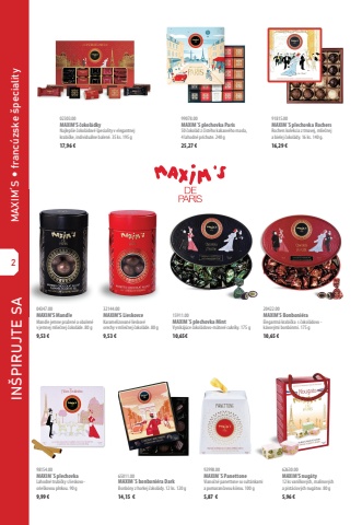 265011.00MAXIM%u00b4S bonboni%u00e9ra DarkBonb%u00f3ny z horkej %u010dokol%u00e1dy. 12 ks. 120 g14,15 %u20ac62630.00MAXIM%u2019S nug%u00e1ty12 ks vanilkov%u00fdch, malinov%u00fdch a pist%u00e1ciov%u00fdch nug%u00e1tov. 80 g5,96 %u20ac98154.00MAXIM%u00b4S plechovkaLahodn%u00e9 trubi%u010dky s lieskovoorie%u0161kovou plnkou. 90 g9,99 %u20ac04347.00MAXIM%u2019S MandleMandle jemne pra%u017een%u00e9 a obalen%u00e9 v jemnej mlie%u010dnej %u010dokol%u00e1de. 80 g9,53 %u20ac32144.00MAXIM%u2019S Lieskovce Karamelizovan%u00e9 lieskov%u00e9 orechy v mlie%u010dnej %u010dokol%u00e1de. 80 g9,53 %u20ac15911.00MAXIM%u00b4S plechovka MintVynik%u00e1j%u00face %u010dokol%u00e1dovo-m%u00e4tov%u00e9 cukr%u00edky. 175 g10,65%u20ac IN%u0160PIRUJTE SA MAXIM%u00b4S %uf097 franc%u00fazske %u0161peciality92998.00MAXIM%u00b4S PanettoneViano%u010dn%u00e9 panettone so sult%u00e1nkami a pomaran%u010dovou k%u00f4rou. 100 g5,87 %u20ac02303.00MAXIM%u2019S %u010dokol%u00e1dkyNajlep%u0161ie %u010dokol%u00e1dov%u00e9 %u0161peciality v elegantnej krabi%u010dke, individu%u00e1lne balen%u00e9. 35 ks. 195 g17,96 %u20ac99078.00MAXIM%u00b4S plechovka Paris50 %u010dokol%u00e1d z %u010dist%u00e9ho kakaov%u00e9ho masla, 4 lahodn%u00e9 pr%u00edchute. 240 g25,27 %u20ac91815.00MAXIM%u00b4S plechovka RochersRochers kolekcia z tmavej, mlie%u010dnej a bielej %u010dokol%u00e1dy. 16 ks. 140 g.16,29 %u20ac20422.00MAXIM%u2019S Bonboni%u00e9ra Elegantn%u00e1 krabi%u010dka s %u010dokol%u00e1dovo - k%u00e1vov%u00fdmi bonb%u00f3nmi. 175 g10,65 %u20ac