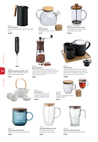 82HRN%u010cEKY %u010cAJN%u00cdKY94139.11Dvojstenn%u00fd d%u017eb%u00e1n Vn%u00fatro z nehrdzavej%u00facej ocele, obal z PP, dreven%u00e1 r%u00fa%u010dka. 1000 ml21,61 %u20ac06011.01%u010cajov%u00e1 s%u00fapravaKeramick%u00e1 %u010dajov%u00e1 s%u00faprava vr%u00e1tane kanvi%u010dky s bambusov%u00fdm uchom (600 ml) a dvoch %u0161%u00e1lok (110 ml).18,14 %u20ac09337.54Mlyn%u010dek na k%u00e1vu Ru%u010dn%u00fd mlyn%u010dek so sklenenou n%u00e1dobou s objemom cca 160 ml, keramick%u00fd mlyn%u010dek, jednoduch%u00e1 manipul%u00e1cia, mlyn%u010dek a k%u013euka z nehrdzavej%u00facej ocele, jednoduch%u00e9 nastavenie hrubosti mletia.9,92 %u20ac86481.31Rebrovan%u00fd sklenen%u00fd hrn%u010dekAk%u00e1ciov%u00e9 vie%u010dko. FSC%u00ae-certiffled. Objem 300 ml6,03 %u20ac40727.11%u010cajov%u00e1 s%u00fapravaVysoko kvalitn%u00e1 keramick%u00e1 %u010dajov%u00e1 sada s matn%u00fdm povrchom a bambusov%u00fdm serv%u00edrovac%u00edm podnosom. Vr%u00e1tane kanvice na %u010daj (500 ml) s vekom z nerezovej ocele a sitkom na %u010daj a dvoch %u0161%u00e1lok (150 ml).22,92 %u20ac10706.82Rebrovan%u00fd sklenen%u00fd hrn%u010dekAk%u00e1ciov%u00e9 vie%u010dko. FSC%u00ae-certiffled. Objem 450 ml6,70 %u20ac31056.66Sklenen%u00fd d%u017eb%u00e1nS bambusov%u00fdm vie%u010dkom. 1000 ml7,11 %u20ac26357.66Sklenen%u00fd k%u00e1vovar alebo %u010dajn%u00edkZ borosilik%u00e1tov%u00e9ho skla s piestom, sitkom a bambusov%u00fdm vekom. 600 ml11,25 %u20ac32221.11Elektrick%u00fd nape%u0148ova%u010d mlieka z ABSDob%u00edjanie cez USB-C k%u00e1bel, ktor%u00fd je s%u00fa%u010das%u0165ou balenia. Ot%u00e1%u010dky: 10000 ot%u00e1%u010dok/min.7,27 %u20ac10255.82Dvojstenn%u00fd sklenen%u00fd hrn%u010dekZ borosilik%u00e1tov%u00e9ho skla s uchom a bambusov%u00fdm vie%u010dkom. 450 ml6,83 %u20ac43635.66Hrn%u010dekDvojstenn%u00fd sklenen%u00fd hrn%u010dek s vekom z bambusu. 350 ml5,25 %u20ac