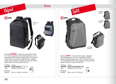 Backpack OXFORD: 1 small front compartment with Backpack PEPPER & SALT: 3 zipped front compartments Backpack DELUXE: padded media pocket with zip and ear-