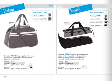 Sports bag VINTAGE: slip-in pocket on the front, 1 zippered front pocket, two small side pockets, front pocket, spacious main compartment, 1 zippered Sports bag MARINA: zippered main compartment,