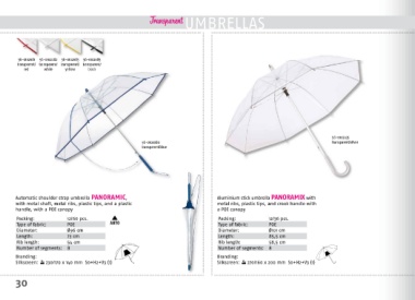 Automatic shoulder strap umbrella PANORAMIC, Aluminium stick umbrella PANORAMIX with Dome-shaped umbrella BELLEVUE: metal shaft and ribs, plastic tips Big aluminium stick umbrella OBSERVER: metal ribs and