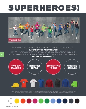 *The branding techniques eligible for two-day branding (after E-proof approval) on the SUPERHEROES styles are Screenprint and/
