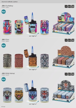 Electronic Refillable Lighters JB-3 Surferboy Art. No.: 12283-01 360° DigiPrint ® JB-3 Skin Art. No.: 12309-01 360° DigiPrint ® JB-3 Wild Animal Art. No.: 12313-01 360° DigiPrint ® 14 Retail