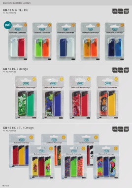 Electronic Refillable Lighters EB-15 Mini TL / HC Art. No.: 10082-02 Mini EB-15 HC / Design Art. No.: 10076-02 EB-15 HC / TL / Design Art. No.: 10089-02 16 Retail