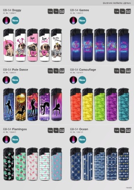 Electronic Refillable Lighters EB-54 Doggy EB-54 Games Art. No.: 12358-01 Art. No.: 12360-01 EB-54 Pole Dance EB-54 Camouflage Art. No.: 12362-01 Art. No.: 12276-01 EB-54 Flamingos EB-54 Ocean Art. No.: 12359-01 Art. No.: 12361-01 Retail 3