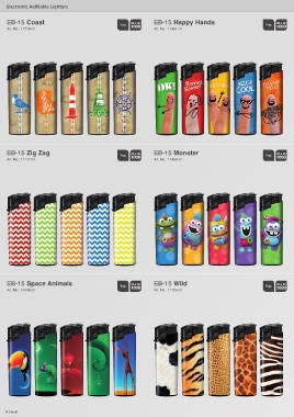Electronic Refillable Lighters EB-15 Coast EB-15 Happy Hands Art. No.: 11718-01 Art. No.: 11961-01 EB-15 Zig Zag EB-15 Monster Art. No.: 11717-01 Art. No.: 11960-01 EB-15 Space Animals EB-15 Wild Art. No.: 10448-01 Art. No.: 11725-01 4 Retail
