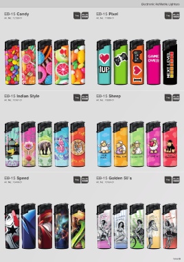 Electronic Refillable Lighters EB-15 Candy EB-15 Pixel Art. No.: 12133-01 Art. No.: 11959-01 EB-15 Indian Style EB-15 Sheep Art. No.: 10761-01 Art. No.: 10280-01 EB-15 Speed EB-15 Golden 50´s Art. No.: 10449-01 Art. No.: 10764-01 Retail 5