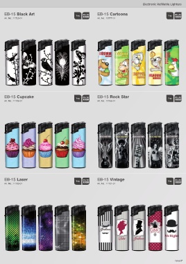Electronic Refillable Lighters EB-15 Black Art EB-15 Cartoons Art. No.: 11723-01 Art. No.: 10777-01 EB-15 Cupcake EB-15 Rock Star Art. No.: 11706-01 Art. No.: 10766-01 EB-15 Laser EB-15 Vintage Art. No.: 11703-01 Art. No.: 11721-01 Retail 7