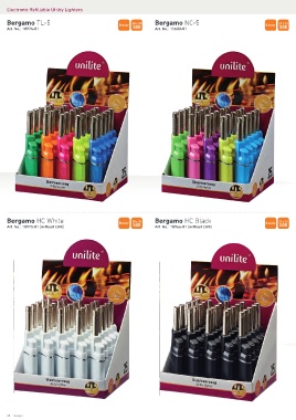 Electronic Refillable Utility Lighters Bergamo TL-5 Display Bergamo NC-5 Display Art. No.: 10974-01 Art. No.: 11600-01 Bergamo HC White Display Bergamo HC Black Display Art. No.: 10975-01 [without EAN] Art. No.: 10966-01 [without EAN] 28 Design